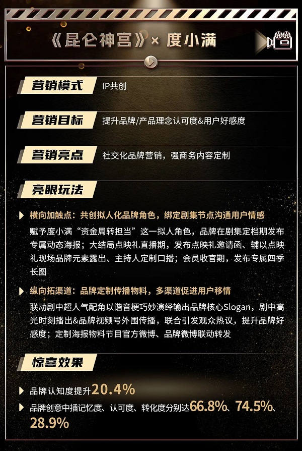 《昆侖神宮》與度小滿的合作案例中,雙方共創的擬人角色綁定劇集重要節點,并在各個渠道發布定制創意中插視頻,集中且高聲量釋放品牌價值。