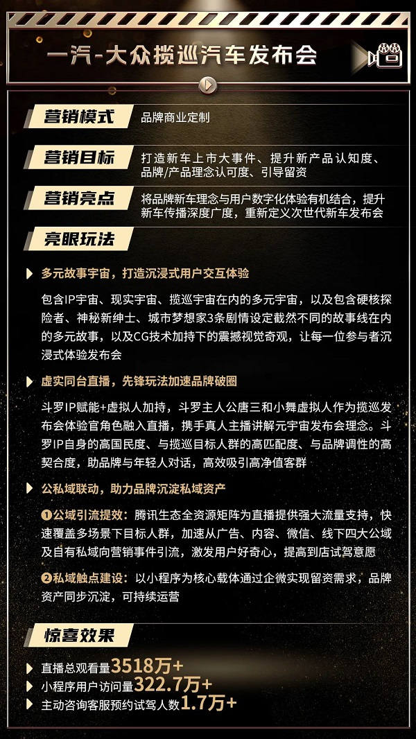 復盤整場發布會,故事、技術、生態是此次品牌商業定制模式的核心關鍵詞。故事上,騰訊視頻根據一汽-大眾攬巡的品牌理念,構建起了不同劇情主線和宇宙世界觀,圍繞核心主線敘事,給予用戶沉浸式共創式的內容體驗;技術層面,主要體現為《斗羅大陸》主角以虛擬人角色亮相發布會現場,虛實結合打造破次元直播形式,這背后也離不開騰訊視頻沉淀多年的技術水平和工業化能力;最后在生態層面,依托騰訊全資源矩陣,微信、線下等公域引流,直播結束后小程序呈現的二維碼添加企業微信等方式又實現了私域蓄水,由此形成沉浸式曝光、互動式轉化、長效經營的全鏈路營銷,助力品牌占領心智,同時驅動用戶消費購買。