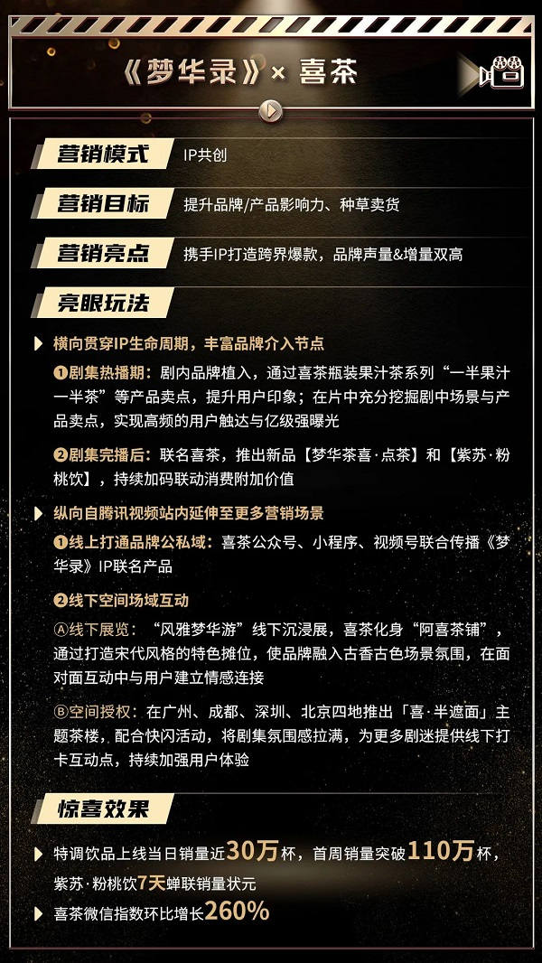 搭載暑期爆款IP《夢華錄》,喜茶橫向貫穿劇集播出全周期,縱向以多種營銷場景拓展人群,通過與劇集深度共創,成功將IP力轉化為品牌力。