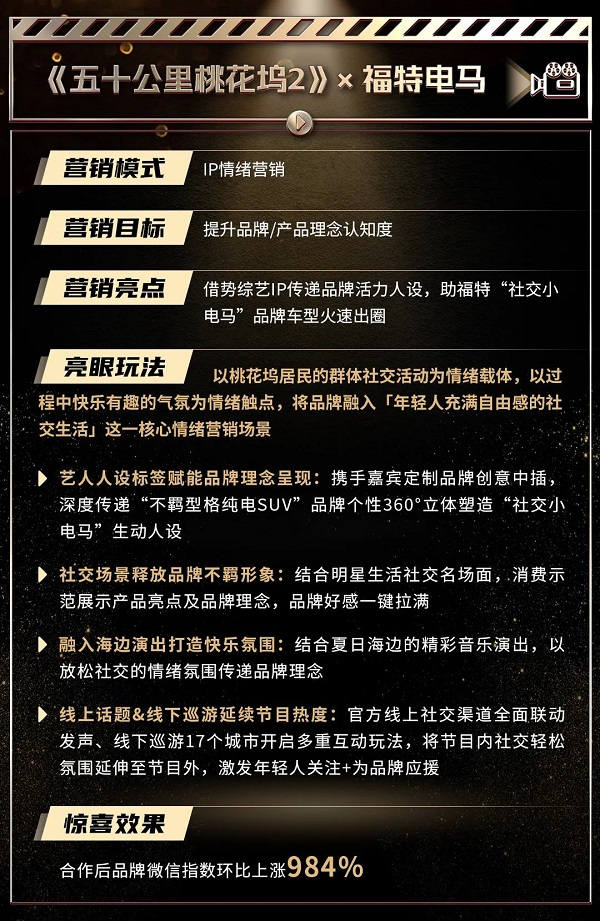以輕松社交的氛圍為情緒觸發場景,《五十公里桃花塢2》與福特電馬以場景植入、線上線下打通,成功輸出品牌活力人設,并助推產品出圈。