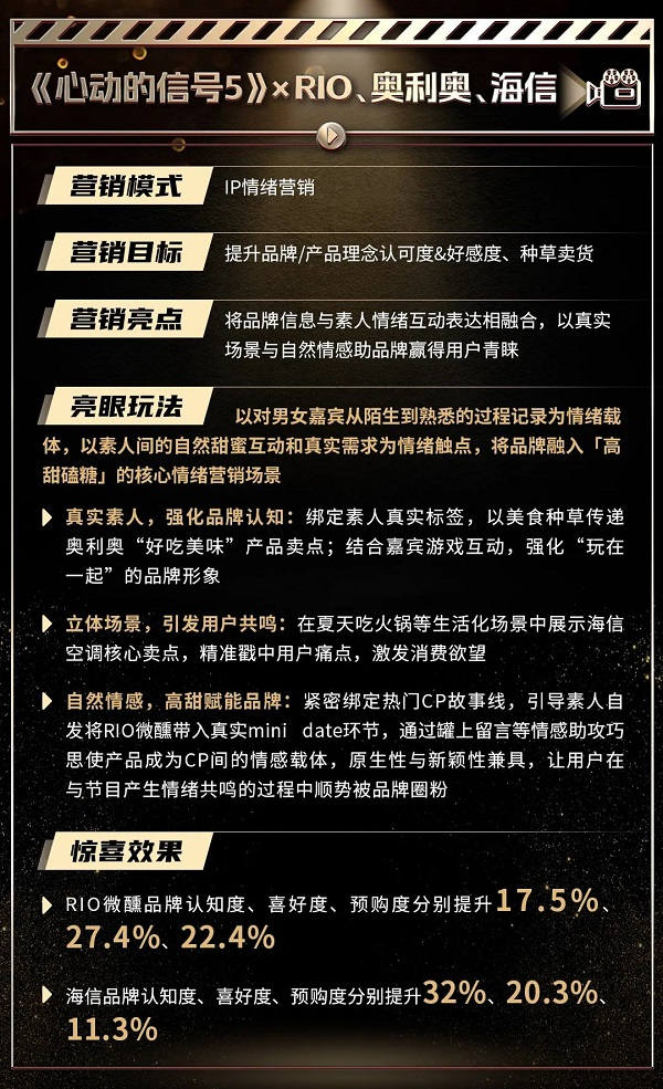 以嘉賓甜蜜互動為情緒觸達點,RIO銳澳、奧利奧、海信置身于《心動的信號5》中的約會、生活場景,化身情感助推器,拉近了與觀眾的距離。