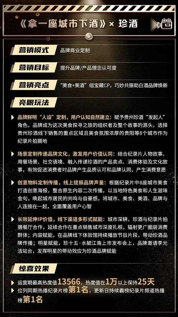 借助人格化營銷、線上線下聯動,紀錄片《拿一座城市下酒》與品牌珍酒從0到1搭建共創體系,為紀錄片商業化開辟了新路徑,也展現了品牌植入的新解法。