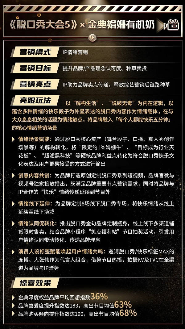語言類節目的優勢在于可以將廣告變成金句和段子,產品賣點變成高能笑點,輕松幽默中打動用戶,實現品牌信息的有效傳達;相比起負面緊張的情緒,帶有快樂氛圍的內容傳播力更強,騰訊視頻為金典原創定制的脫口秀短視頻,在社交平臺充分釋放和發酵,快樂情緒也延續到節目外并達成了自來水傳播。