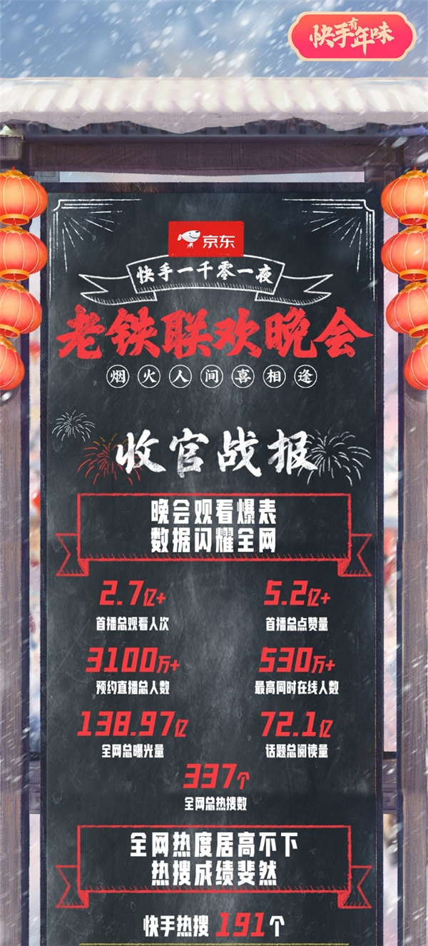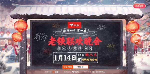1月14日晚8點,由京東電器獨家冠名、一汽大眾攬勝特約播出的“快手一千零一夜老鐵聯歡晚會”如約而至,近百位明星達人齊聚快手直播間,與來自天南海北的老鐵歡喜相逢,共慶小年夜。在長達兩個半小時的直播中,明星大咖與快手用戶同臺,經典旋律與熱血國風融合,溫情故事與唯美畫面交織,帶來了一場真正屬于老鐵的視聽盛宴,也將直播間人氣不斷推向新高。