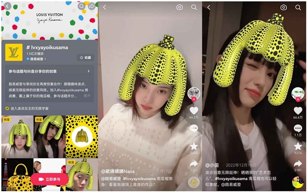 這一回,LV呼應草間彌生聯名新品,提煉出其中最標志性的波點南瓜元素,在抖音定制“波點南瓜帽”AR貼紙,并發起藝術家聯名抖音話題#lvxyayoikusama,邀請廣大用戶共同參與。