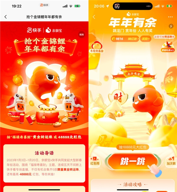 而余額寶平臺也同步推出“躍龍門”互動游戲,呼應(yīng)“年年有余”主題。兩大平臺聯(lián)手發(fā)力,直擊用戶對新年的美好期許心理,從而激發(fā)大眾雙平臺參與熱情,在玩游戲、賞年俗、猜答題之余也能收獲搶錦鯉的快樂。