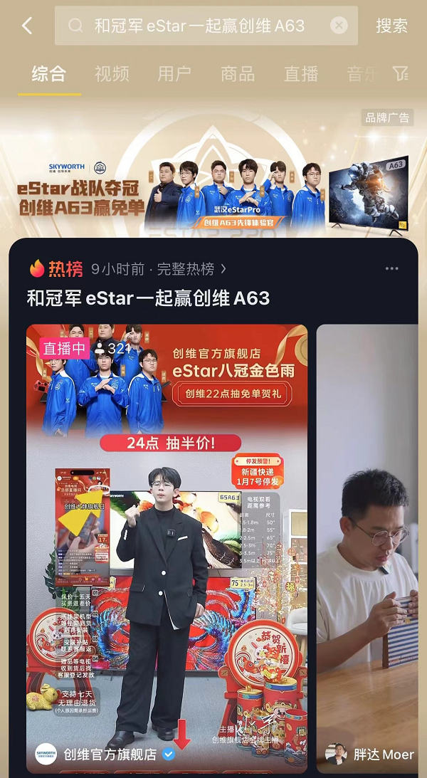 因此,作為行業首批布局游戲電視賽道的品牌,創維在這次“抖音好物年貨節”中發力更加聚焦,主打游戲電視系列產品,無疑是看中了抖音平臺年輕用戶占比高、游戲內容熱度高兩大特征?;顒悠陂g,創維與王者榮耀頂級戰隊eStarPro圍繞2022年王者榮耀世界冠軍杯開展電競營銷動作,包括借勢eStarPro奪冠話題綁定種草視頻、話題導流賽事同款裝備、電競專場直播等,在貨架場景聯合抖音旗艦打造標桿營銷大事件“創維旗艦大牌日”,最終在年貨節迎來了銷售爆發。
