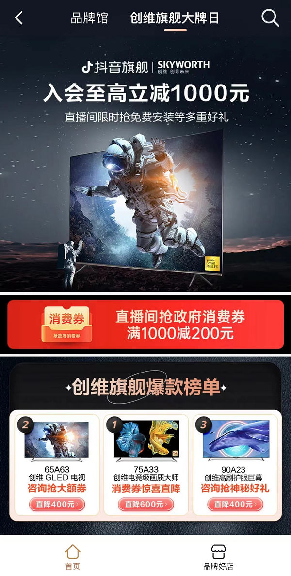 2023新年伊始,抖音旗艦的家電頭部品牌創維電視在抖音“好物年貨節”中打響開門紅:品牌人群資產環比提升565.5%,整體GMV同比增長230%,這次活動中主打的兩大產品電競級畫質大師A33系列、創維GLED電視A63系列均表現亮眼,75英寸及以上大屏電視銷量同比增長328.3%。