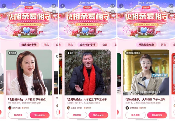 近年來,直播相親模式備受老鐵青睞,基于快手獨(dú)特的直播產(chǎn)品形態(tài),“快相親”業(yè)務(wù)在2022年正式上線。今年春節(jié)期間,為了呼應(yīng)越來越濃烈的婚戀氛圍,“快相親”特別邀約主持人袁哲、王孟閣、女神相親團(tuán)等平臺金牌紅娘,在河北、山東、吉林、遼寧等8個省份發(fā)起66場本地相親直播。大年初三到初六,紅娘還將帶男嘉賓上門拜年,面對面溝通讓相親更具年味。