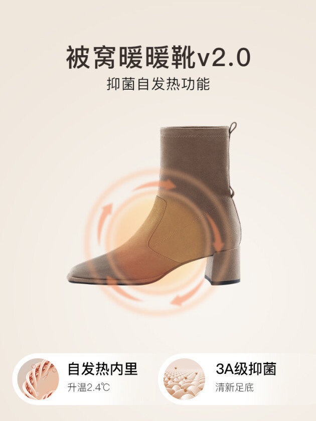 更暖: 在v1.0版本升溫2.1℃的基礎上再升級,將更高比例的紅外發熱原理,添加進抑菌自發熱德絨內里,雙腳穿上靴子時的接觸面可升溫2.4攝氏度;