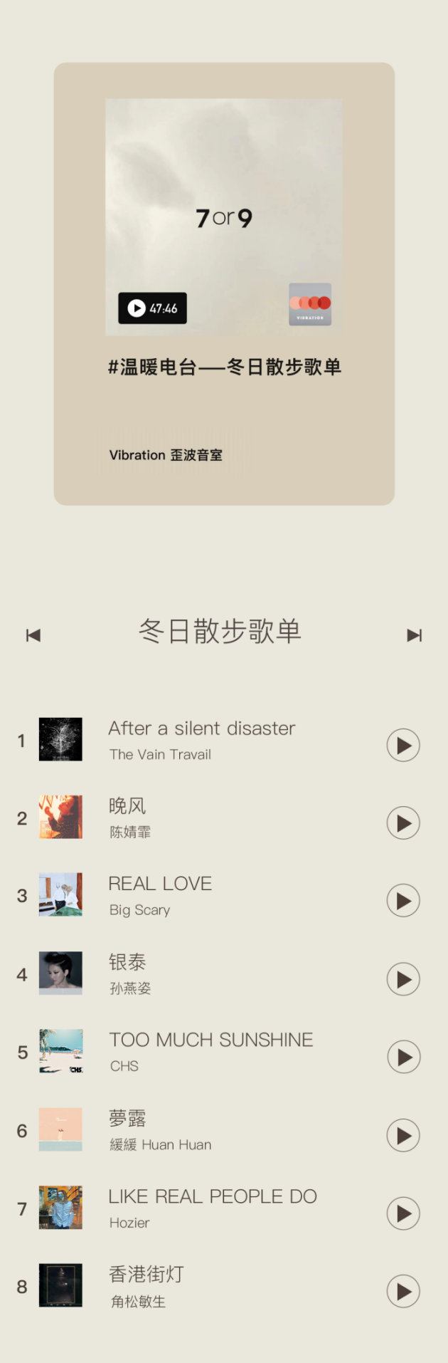 對溫暖的感知是多維度的,7or9在內容上也做出更多嘗試,結合2022年感恩節節點,與治愈系播客Vibration歪波音室聯合企劃《冬日散步》電臺節目,節目以7or9被窩暖暖靴冬日散步的場景為靈感,加入主播推薦的冬日散步歌單以及原創詩,用聽的方式,傳遞節日不一樣的溫度。