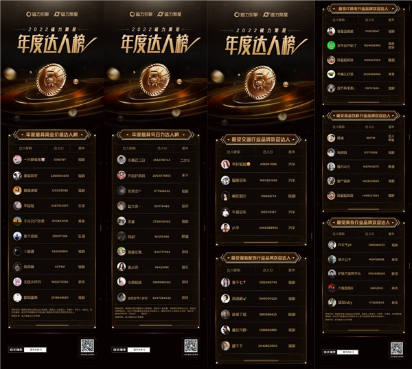 在達人側,年度最具商業價值達人榜、年度最具號召力達人榜、年度最受行業品牌歡迎達人榜三個榜單,從達人價值、號召力、客戶選擇三個方向,結合“達人五力模型”,對達人能力進行多指標數據衡量,體現出磁力聚星達人在商業化方面的高承接能力。其中,憑借高水平創作和運營,一只靜豬豬、小嘴巴二白分別登上年度最具商業價值達人榜和最具號召力達人榜榜首,學好姐姐、麥子七、我是田姥姥、楊迪、葉公子ye則分別位居交通、服裝配飾、IT消電、食品飲料、美妝行業最受品牌歡迎達人。