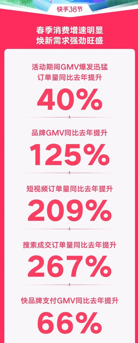 近日,快手電商正式發布2023快手38節大促戰報。數據顯示,今年38節期間(3月1日-8日),快手商家GMV爆發迅猛,訂單量同比去年提升40%,品牌GMV同比去年提升125%,短視頻訂單量同比去年提升209%,搜索成交訂單量同比去年提升267%,快品牌支付GMV同比去年提升66%。