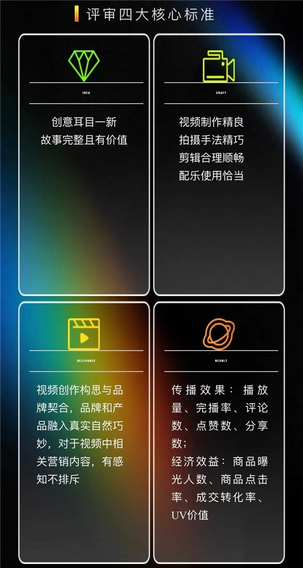 ?多維度,讓實力出圈:星瀚獎將結合雙方視角從優質創意及其背后的商業價值審視短視頻作品,設置創意(IDEA), 制作(CRAFT), 品牌契合度(RELEVANCE)和視頻數據(RESULT) 四個維度的三大類,25個子項目的獎項,不唯流量,讓實力出圈。