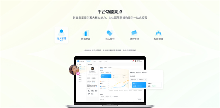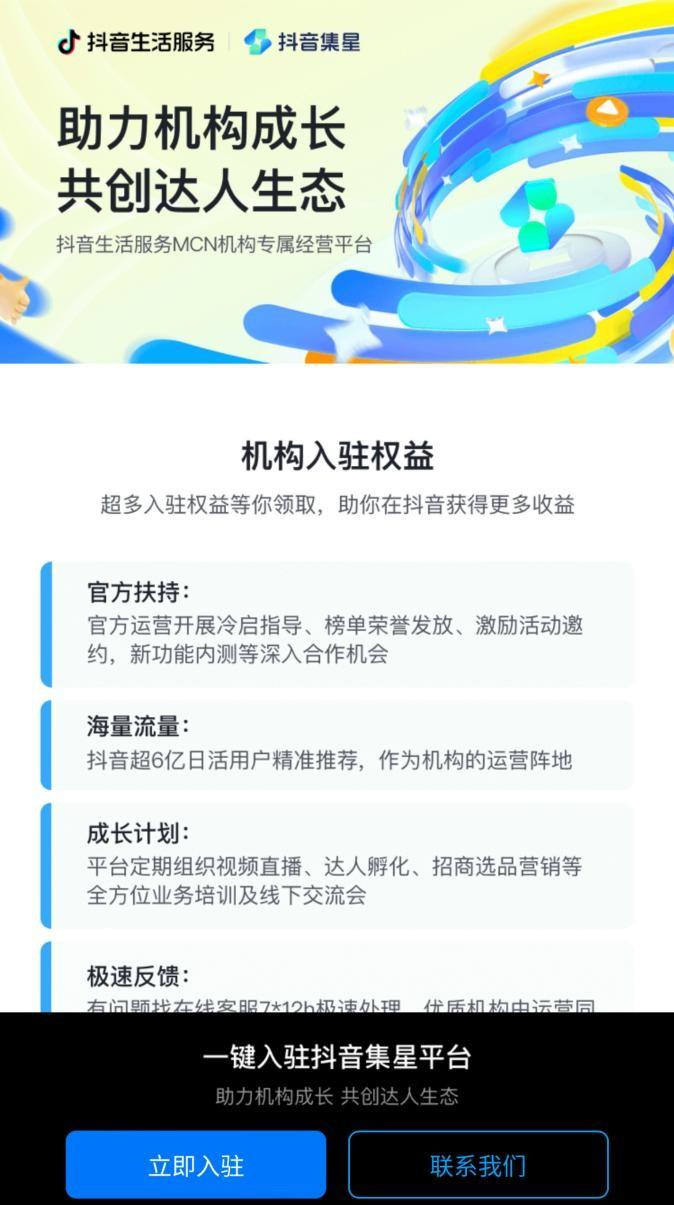 2023年,抖音生活服務機構平臺全新升級為「抖音集星」,為機構的入駐與經營提供更細致、專業的服務,助力機構更好地成長。「抖音集星」是抖音生活服務機構專屬經營平臺,為機構提供一站式便捷高效的達人管理工具,包括但不限于機構與達人的綁定/解綁、分賬結算、短視頻/直播/商品/推廣數據分析、糾紛調解、權限劃分等功能,保障機構和達人的權利,提升機構運營效率,規范行業生態。
