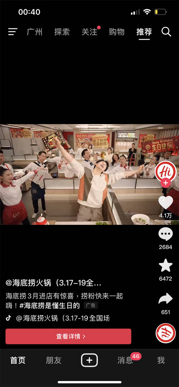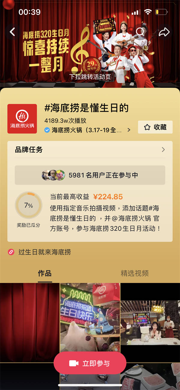 “作為一名資深撈粉,每次過生日必備節目,就是帶上家人朋友,來海底撈過生日,七年多的時間里,每一次過生日都在海底撈,光自己一個人就有超過1000次的海底撈就餐體驗”,來自廣州的海底撈粉絲在社交平臺上說道。海底撈生日月活動一開始就迎來分享熱潮,不少網友激動曬出自己在海底撈過生日的故事。海底撈迅速捕捉用戶對于生日分享欲,在抖音端上線#海底撈是懂生日的話題挑戰賽,鼓勵用戶曬出在海底撈生日的每一個幸福瞬間,實現自來水式的分享營銷。