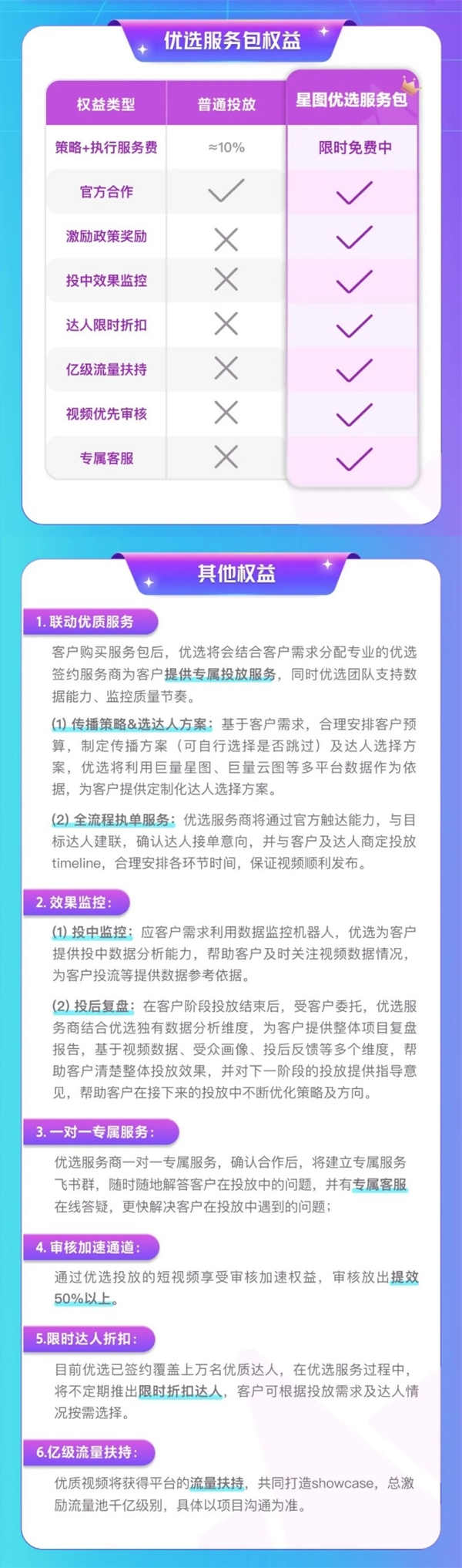 如果你也想獲取星圖優選提供的更多服務,可登陸「巨量星圖網站-【星圖優選】」購買巨量星圖優選服務包(僅支持購買資格審核通過的客戶購買),還可享受優選專屬服務。此外,除專屬權益外,還可按規則享受首次充值與復購贈款優惠。2023年優選服務包權益如下:
