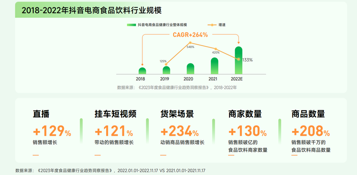 抖音電商食品飲料行業(yè)也快速增長,2022年同比增長133%,2018-2022年的復(fù)合增長率更高達264%,遠超整體線上市場大盤增速。直播、掛車短視頻、貨架場景均增長良好,實現(xiàn)以內(nèi)容驅(qū)動生意增長,高效轉(zhuǎn)化消費興趣。