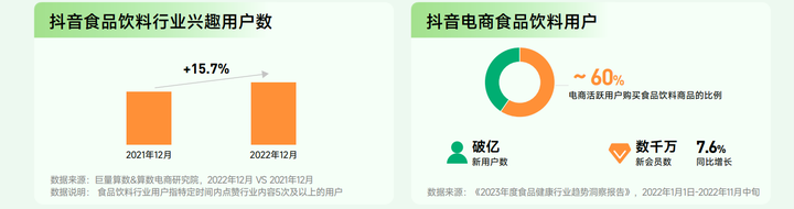 場域的發(fā)展與用戶活躍形成正循環(huán),2022年12月,抖音食品飲料行業(yè)興趣用戶數(shù)同比增長15.7%。用戶也將興趣轉(zhuǎn)化為購買,在電商活躍用戶中,近6成購買過食品飲料產(chǎn)品;而大量新用戶和新會員的涌入,為抖音食品飲料行業(yè)發(fā)展提供了新動能。