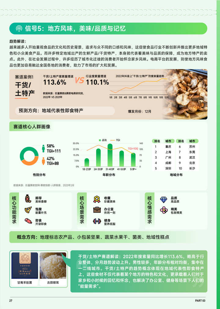 越來越多人開始重視食品的文化和歷史背景,追求與眾不同的口感和風味,這促使食品行業(yè)不斷創(chuàng)新和推出更多地域特色和小眾美食產(chǎn)品。而許多特定地域出產(chǎn)的生鮮產(chǎn)品/干貨特產(chǎn),本身就代表著美味與品質(zhì)的保障,成為地方特產(chǎn)的賣點。此外,在社會發(fā)展過程中,許多經(jīng)歷了城市化遷徙的消費者開始懷念家鄉(xiāng)風味。電商平臺的發(fā)展,則使地方風味食品也更加容易觸達全國各地的消費者,助力了市場的擴大和發(fā)展。