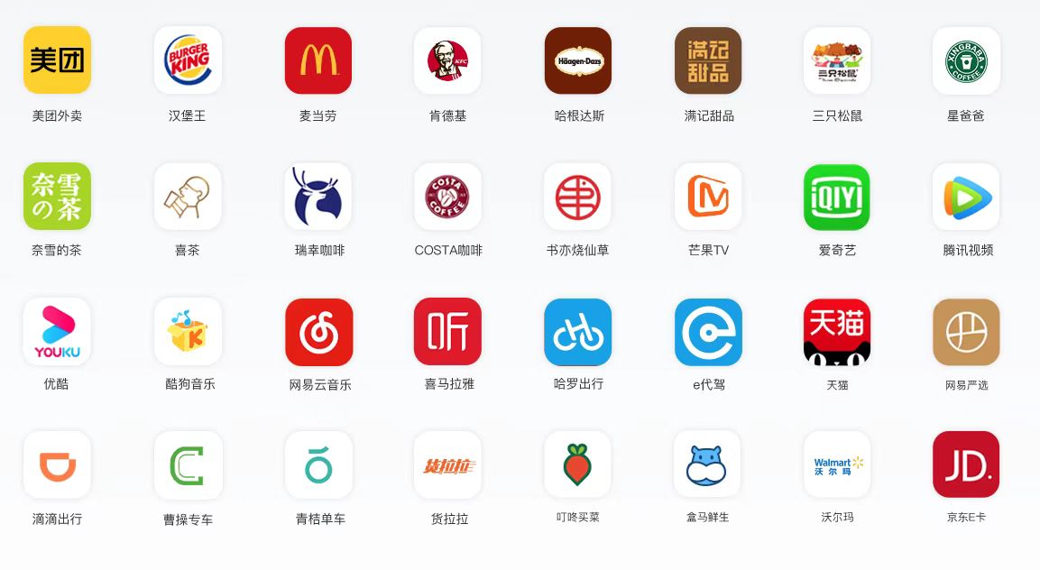 生活類:星巴克、肯德基、必勝客、麥當勞、瑞幸咖啡、奈雪的茶、美團外賣、餓了么、喜茶、哈根達斯、costa、貓眼、淘票票、OK優(yōu)選、中影票務(wù)通、keep、E袋洗、福奈特、樊登讀書、得到讀書、懶人聽書、掌閱、凱叔講故事、百度網(wǎng)盤、百度文庫、WPS等等