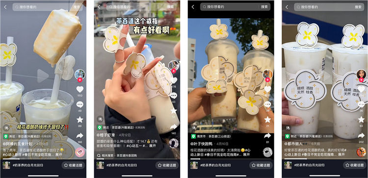 4月中旬,茶百道借助「心動上新日」與中國國家地理聯(lián)合舉辦的“春日花食發(fā)聲展”在線下陳列展示桂花酒釀奶綠新品,并贈送給觀展用戶進(jìn)行免費試喝。“春日花食季”的活動主題為新品增添幾分古韻氣質(zhì),我國自古以來文人雅客有“食花”的春日情調(diào),活動以此進(jìn)行科普,為新品增添浪漫情調(diào),提升用戶期待值。
