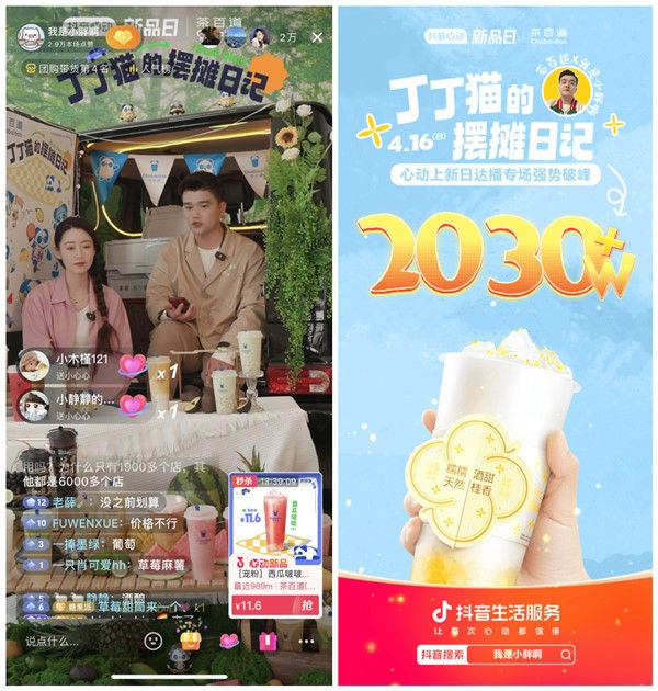 經(jīng)過此前線上線下聯(lián)動的不斷加碼,為桂花酒釀奶綠新品贏得巨大的聲量勢能,如何承接這一系列營銷動作使之完成從熱度發(fā)酵到銷量轉(zhuǎn)化的閉環(huán),則成為了茶百道這次新品回歸活動的關(guān)鍵一環(huán)。為此,茶百道于4月16日迅速落地以【丁丁貓的擺攤?cè)沼洝繛橹黝}的達(dá)人直播專場,以此作為承接流量的最后一站,將有節(jié)點、有記憶、有曝光、有承接的鏈路式玩法貫徹到底。