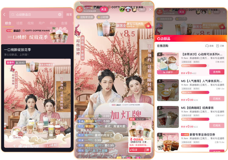 與此同時,庫迪咖啡將本次主推新品鎖定在“杏桃花”這一極具春日記憶的選題之上,以“一口桃醉,綻放花季”為節點營銷主題,全面打響“品牌突圍戰”。與抖音生活服務「心動上新日」聯合進行新品首發,在抖音平臺策劃熱點話題#春天的溫柔都在粉色里 為全網用戶種草其主打新品“桃醉系列”。