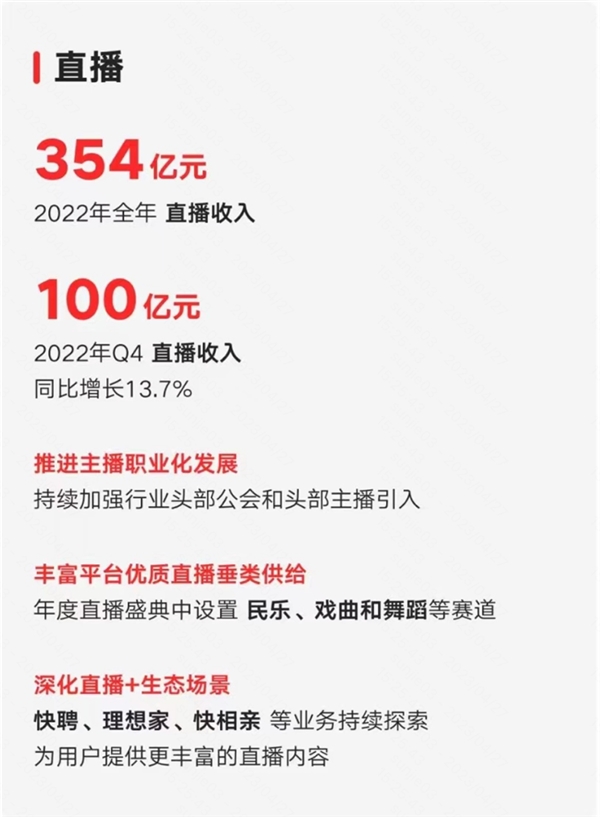 公開資料顯示,2022年第三季度,快手直播DAU(日活躍用戶)滲透率已達近80%;2022年第四季度,快手應用的平均日活躍用戶達到3.66億,同比增長13.3%;與此同時,直播用戶付費意愿在不斷增加,2022年全年,快手直播收入達到354億元。各項數據表明,快手直播仍處在業務增長的快車道上。