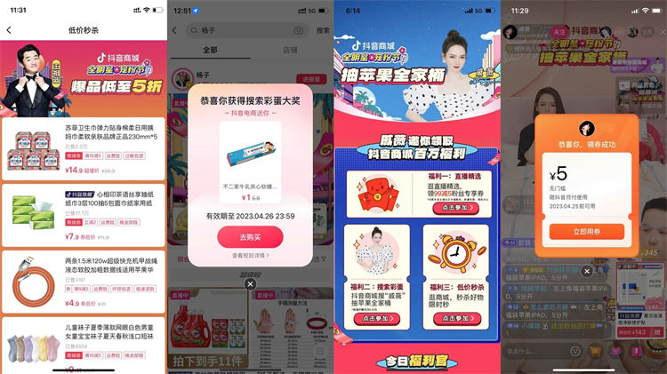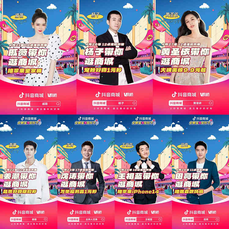 4月21日至4月27日,抖音商城開啟“全明星寵粉節(jié)”,以全新的用戶視角,聚攏平臺頭部明星&達人,通過全渠道助力用戶進入商城新入口完成打卡任務獲取福利,探尋明星流量效應下抖音商城增量空間。本次活動攜手戚薇、姜潮、沈濤、王祖藍、田亮、楊子、黃圣依七位平臺頭部明星化身抖音商城福利官,帶著各種商城福利、直播間玩法,為消費者派發(fā)優(yōu)質(zhì)福利。