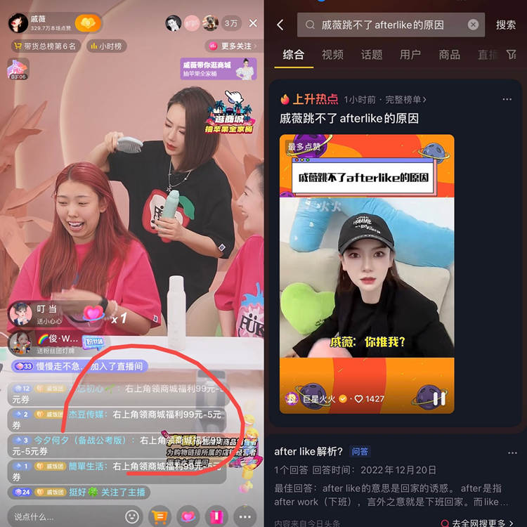 而站在明星和經(jīng)紀機構(gòu)的角度,抖音商城千萬量級的平臺流量加持,加之商城福利官、寵粉節(jié)主理人等“新角色身份”,無疑也有助于增幅明星個人IP自身的商業(yè)價值。僅拿首場戚薇舉例,開播期間,包括iPhone14、iPad9等在內(nèi)的蘋果全家桶1分錢購搜索彩蛋抽獎福利,一經(jīng)公布即引發(fā)轟動,瞬時涌入的人群創(chuàng)造直播間同期峰值,當晚銷售額突破600萬,評論互動量超150萬,話題#戚薇跳不了afterlike的原因 引發(fā)公眾熱議,相關話題播放量超1200萬,一舉沖上抖音熱榜。在明星寵粉并再次交出亮眼的帶貨成績單之余,既成功豐富了明星本尊人設維度、鞏固了明星自身的粉絲用戶人群,也能幫助明星團隊拓寬未來的招商合作方向,從中發(fā)現(xiàn)和鎖定長期、穩(wěn)定、優(yōu)質(zhì)的品牌商家合作伙伴,雙向維度促成明星IP商業(yè)價值增長。