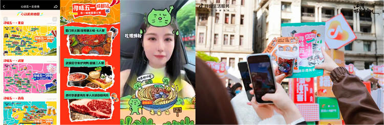 線上首發「五一美食攻略地圖」動態H5專屬頁面,讓用戶快捷直達商家主頁、提前下單、預訂優惠、到店暢吃,盡享一城一風味。深度聯動可愛動畫形象焦綠貓IP在抖音站內外互動,吸引用戶和焦綠貓一起,跟著「美食攻略地圖」在路上“用美食吃掉焦慮”。線下,在武漢、北京兩大熱門城市,開啟多品牌跨界互動玩法,派發紙質版「五一美食攻略地圖」,讓當地特色美食店鋪被發現,讓用戶在線下玩法中探索到更多隱藏快樂。