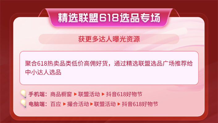 從種草蓄水到深度激發消費意愿,再到最終完成交易,內容始終達人經營的主戰場。抖音618好物節將通過豐富的內容爆發玩法,為達人618生意增長突圍提供助力。「好物直播間」將為達人提供運營、貨品補貼扶持,幫助達人找到更高效的直播帶貨方法論;「精選聯盟618選品專場」則為中小達人與商家的撮合提供了一個高效渠道,達人可以獲得更豐富的貨品選擇、更多元的高傭好貨,用好物種草撬動事業增長。