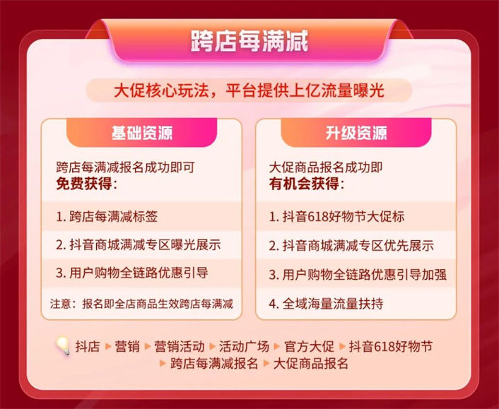 618節點營銷的關鍵,是在短時間內有效吸引用戶注意力,因此定金預售等“搶跑動作”,以及跨店每滿減的大促氛圍感打造必不可少。618好物節將通過「定金預售」,為商品提供商城首頁等曝光資源,幫助商家提前鎖定大促氛圍,實現超前蓄水;作為大促核心玩法的「跨店每滿減」,為商家提供了上億流量曝光,商家報名即可享標簽、曝光、全鏈路優惠引導,部分優質商品還有機會獲得大促標、優先展示、引導加強、流量扶持等多重升級資源,為爆品打造、店鋪引流鋪路。