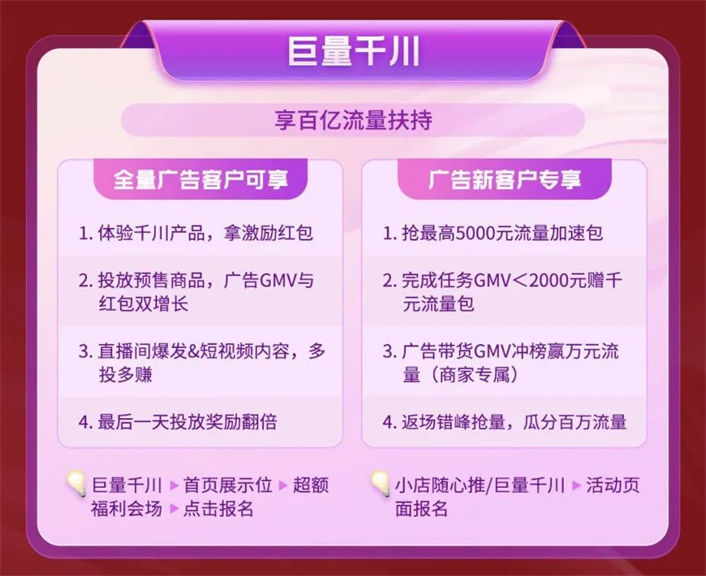 此外,巨量千川也將給予達人百億流量扶持,為全量廣告與新客戶提供扶持權益。達人參與即可獲激勵紅包、廣告GMV與紅包、流量加速包等多重資源,用推流為生意加熱。