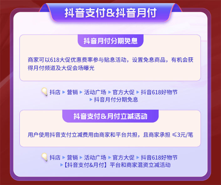 在財經玩法方面,「抖音支付&抖音月付」將分別通過分期免息、支付立減等方式,加快用戶交易決策;「放心借-小微專享」與「提前收款」將解決商家資金周轉問題、縮短收賬周期,為商家提供更良性的生意環境;還有「運費險」補貼保障,促進用戶下單轉化,減少商品退換貨產生的運費糾紛。