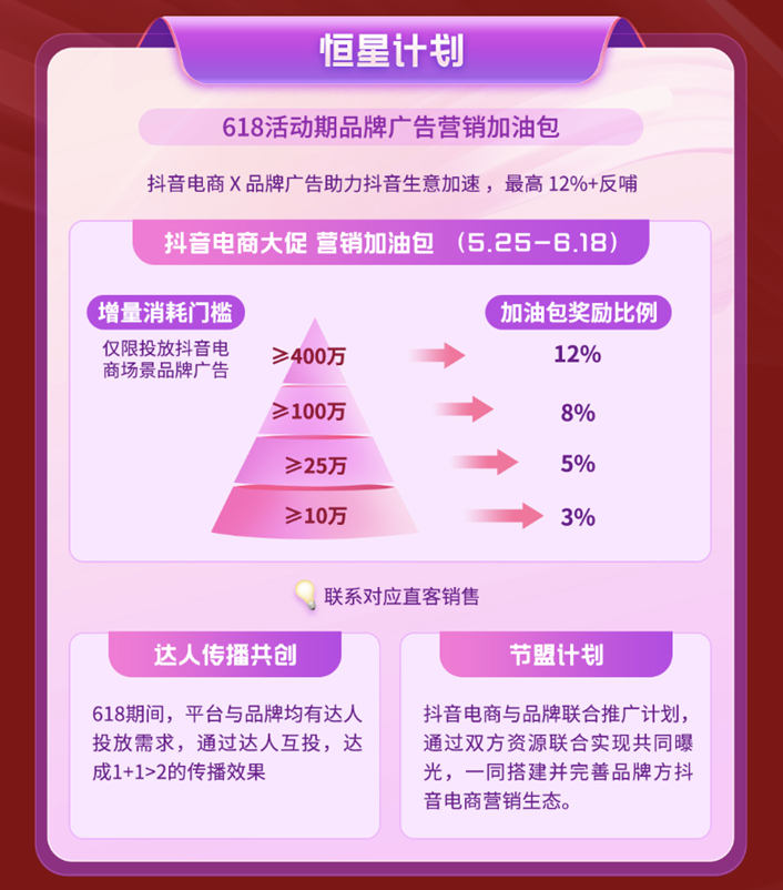 為了促進全域增長,抖音電商還推出了營銷增長、財經補貼玩法,幫助商家進一步拉升人群、貨品與生意增長。「巨量千川」將通過百億流量扶持,為全量廣告客戶與新客戶分別推出激勵紅包、加速包、流量包等扶持;「恒星計劃」將為商家提供品牌廣告營銷加油包,以最高12%的反哺,助力抖音生意加速;此外,「達人傳播共創」與「節盟計劃」也將分別通過達人互投放、資源聯合等方式,共建完善的大促營銷生態。