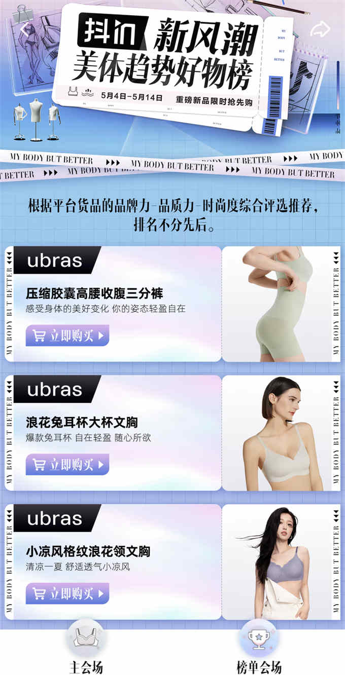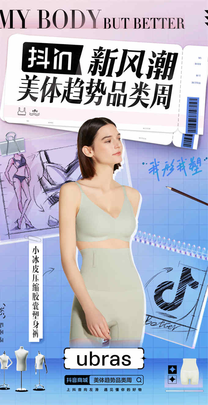 解決行業需求,抖音電商聯合ubras等頭部商家發起“抖in新風潮·美體趨勢品類周”,旨在助力商家傳遞“舒適健康、美觀多元”的塑身新理念、首發引領行業趨勢的新品,以品類新觀念推動品牌增長。