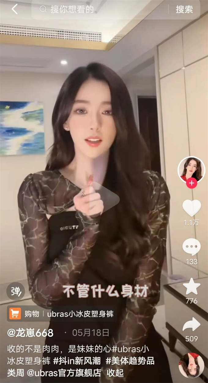 活動中,ubras反向向產業鏈搜索尋找當下新的面料和技術,推出“輕塑身”概念。此外,活動期正值5月初夏,ubras打出“涼感面料”這第二個核心產品理念,滿足消費者的應季需求。基于在抖音電商的內容拉新的優勢,品牌與行業IP共創內容,做了一系列聯合式的宣傳,包括聯動發布品類宣傳片、專題海報,在Topview等展示位策劃營銷等,嘗試與年輕消費者形成共鳴。
