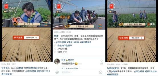 在營銷內(nèi)容上,配合新機型暢享60X上市,《快樂10分鐘》將產(chǎn)品與綜藝場景和內(nèi)容進行深度結(jié)合。暢享60X不僅作為關(guān)鍵道具,自然融入查看任務(wù)、挑戰(zhàn)計時、拍照留念等場景,還借由拍照記錄藍莓苗長勢、一鍵調(diào)起備忘錄記錄工作等場景,突出其7000 mAh超長續(xù)航、X鍵快捷鍵一鍵直達等核心賣點。同時快手也通過短視頻話題、側(cè)邊欄banner等豐富資源,進一步助力品牌聲量爆發(fā)。