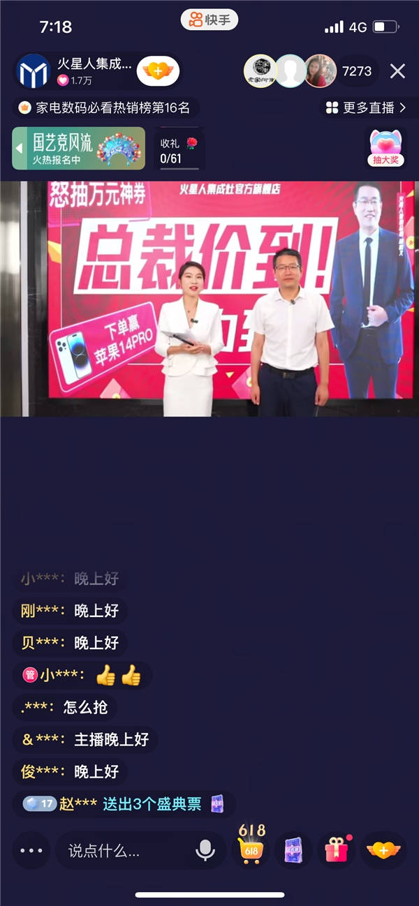 每年年中大促匯聚了用戶的消費需求,成為眾多品牌商家生意爆發的高潮期。6月17日晚,集成灶行業頭部品牌火星人開啟了“總裁價到”快手直播大場,釋放大促優惠,強勢吸引用戶關注,實現生意破峰。整場直播總觀看人次超200萬,618期間GMV超1500萬。