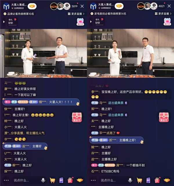 在本次618大促的活動大場內,火星人集成灶營銷總裁胡明義親臨直播間,和用戶們熱情互動,并講解產品功能、演示產品使用。通過創新自播內容場景,采用品牌總裁空降直播間的方式,拉近了品牌與用戶間的距離,增強話題性,帶動更多用戶參與活動。