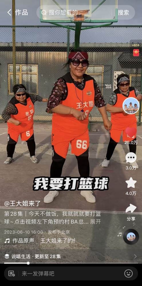 原創作者@王大姐來了 也借著此次《我要打籃球》 出圈,收獲了24萬+點贊,得到了更多人的關注與喜愛。王大姐原本是生活在北京市密云區溪翁莊鎮的地道農民,在兒子的幫助下,她與兩個“老姐妹”一起開設了快手賬號,用說唱音樂的形式分享自己的農村生活。其接地氣與正能量的風格,與村BA純粹、樸素的鄉村籃球氛圍完美契合,將鄉村人民對于籃球運動的淳樸熱愛表達得淋漓盡致,成功感染到了廣大網友。