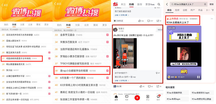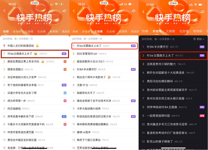 這首由快手達人@王大姐來了 創作演繹的神曲《我要打籃球》,作為全網首支村BA主題曲,憑借洗腦的歌詞、動感的節奏,一經發布迅速走紅網絡,話題#村BA主題曲太上頭了 沖上快手總榜TOP1,獲得2.3億播放量,同時該歌曲相關話題也在站外多個主流社交平臺占據熱搜熱榜,全網總曝光量達5.41億。