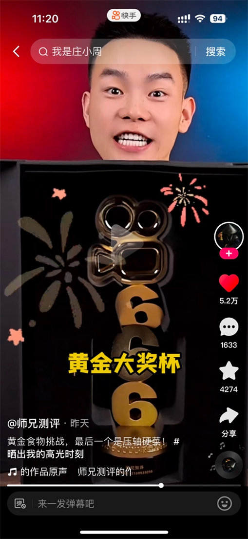 而美食區(qū)的師兄測評(píng)(快手ID:2169935056)就玩的更花了,狠狠咬一口獎(jiǎng)杯不說,更是認(rèn)證:快手獎(jiǎng)杯還真不是真金的!