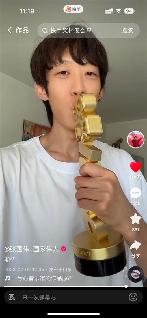 如張國偉(快手ID:861573855)在去美國比賽的前一天還專程回家拆箱獎(jiǎng)杯,給獎(jiǎng)杯來了個(gè)深情kiss~還喊話快手官方,期待2000w獎(jiǎng)杯,對(duì)此小編表示收到!