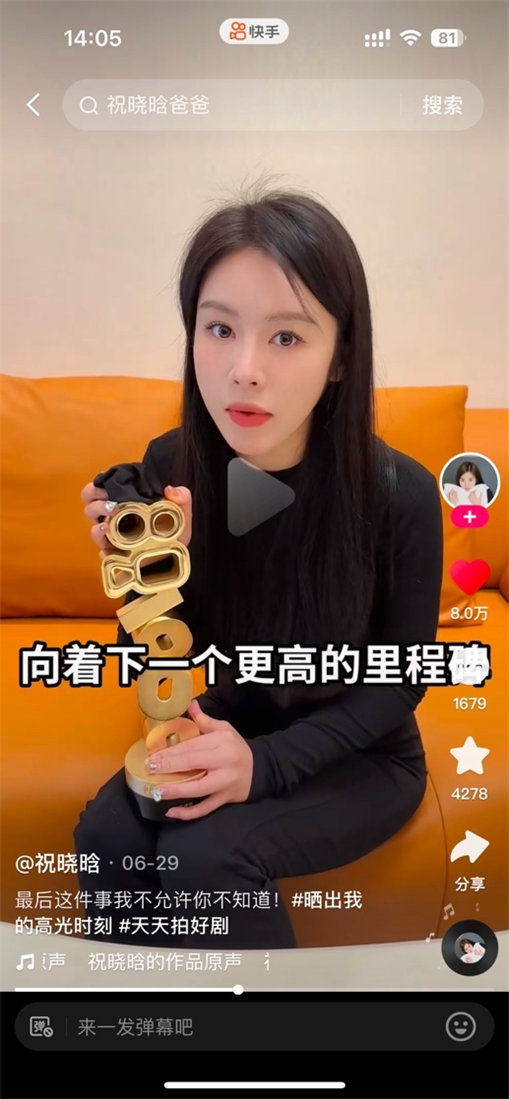 祝曉晗(快手ID:917113506)作為美女里的笑果擔(dān)當(dāng),不僅把獎(jiǎng)杯拿出來擦了又擦,更是在視頻里立下flag:要向更高的里程碑邁進(jìn)!