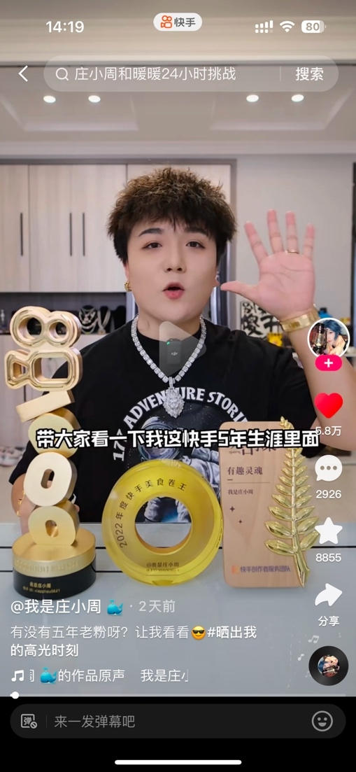莊小周(用戶ID:951269088)更是一口氣曬出來在快手創(chuàng)作的這5年獲得的所有獎(jiǎng)杯,召喚老粉,和粉絲大玩回憶梗。