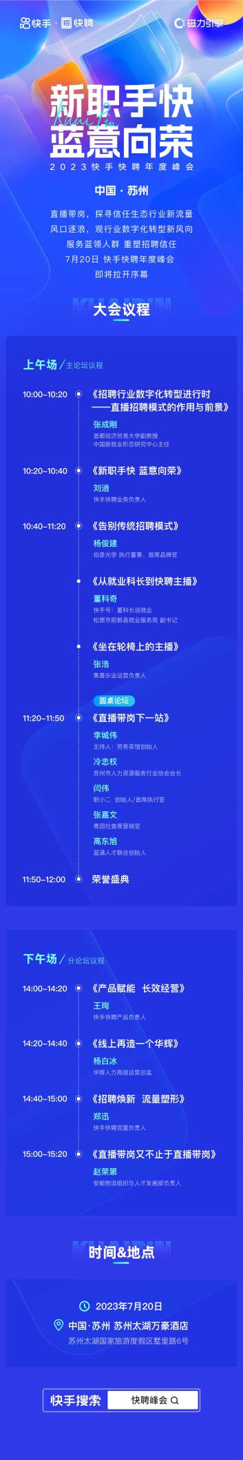 持續為行業帶來新增量的快手快聘將為藍領招聘行業帶來怎樣的新契機?如何進一步通過技術和算法推送就業領域的效率?直播帶崗將往什么方向發展?7月20日,在2023快手快聘年度峰會,快手快聘業務負責人劉逍、快手快聘產品負責人王珣、快手快聘流量負責人鄭迅將全方位解讀快聘業務的扶持政策升級、產品賦能與流量提效,一起聚焦直播帶崗新發展,探索線上招聘長效經營,加速推動數字化促就業的新突破。