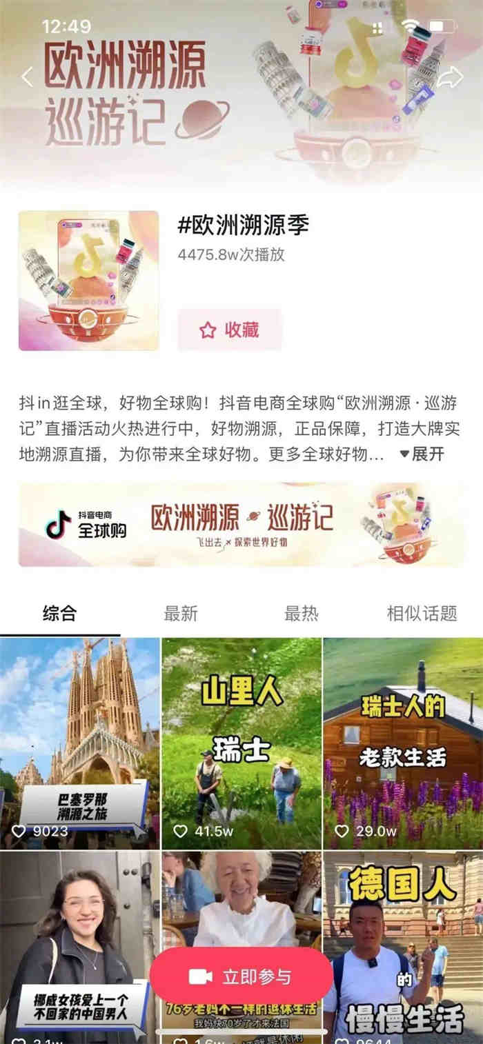 抖音電商全球購結合「巡游記」直播事件,打造#歐洲溯源季 話題,吸引更多用戶參與討論,分享自己的心動海外好物,海量的內容池則承擔起消費者對跨境品牌認知、商品種草、引導轉化等不同角色。截至目前,活動主話題播放量已累計近4475.8萬次播放。